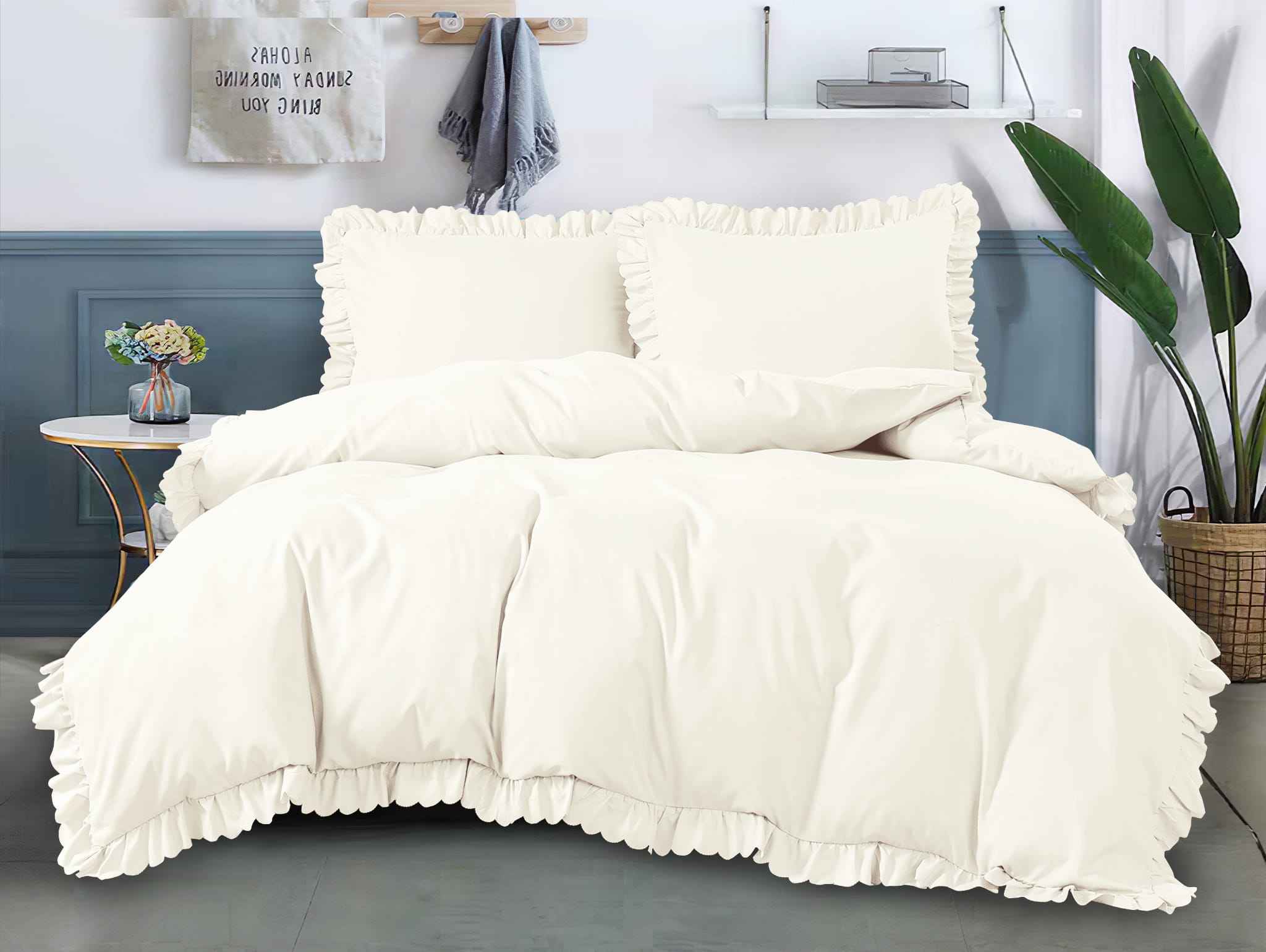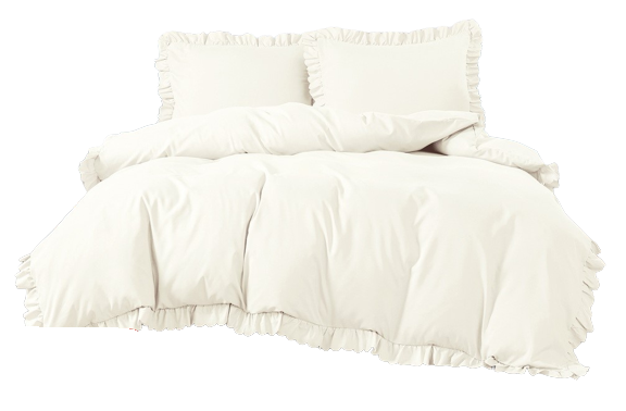 Pościele ozdobione są przepiękną falbanką w kolorze pościeli.