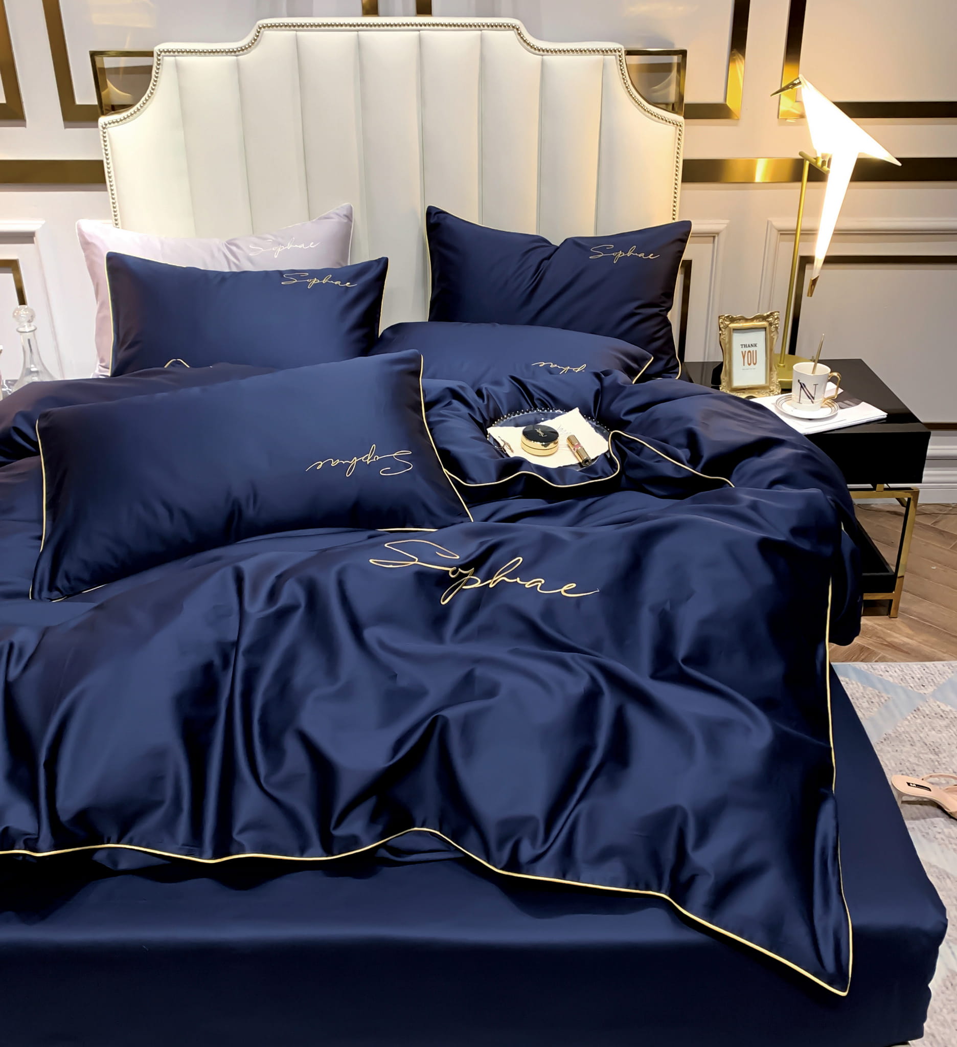 Pościele ozdobione są przepiękną lamówką.